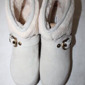 Suede/real shearling upper, leather lining, rubber sole