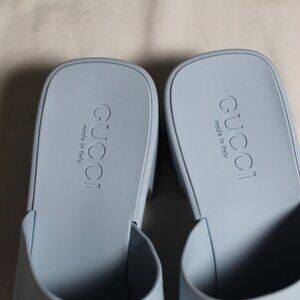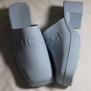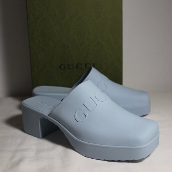 NWB Gucci Logo Rubber Clogs Mules Slip Ons Light Blue 37 725899