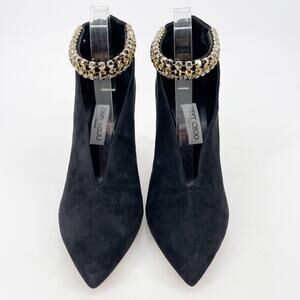 NWB Jimmy Choo Lux 100 Black Suede Gold Crystal Ankle Strap Vamp Bootie IT 41