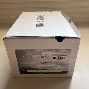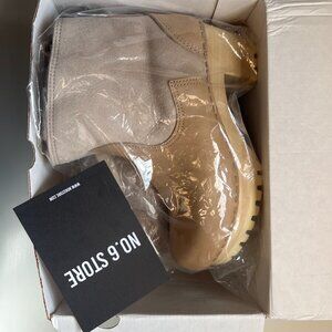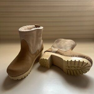 No. 6 5" Pull-On Shearling Clog Boot on High Heel, in Bone Suede with treaded sole. Size 39. They have a 2.75" heel with 1.5" front platform. Water repellant sheepskin and cow leather upper. Wood base with polyurethane sole. NEVER WORN AND IN ORIGINAL PACKAGING (I bought the wrong size then missed the return deadline). Retails for $430. Full description here: https://no6store.com/products/no-6-5-pull-on-shearling-boot-on-high-heel-in-bone-suede