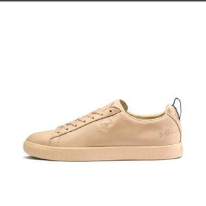 NWB the box said size 9 but they are 9.5 beige low-top sneakers with a sleek design. Features a unique heel tab with blue and green accents.