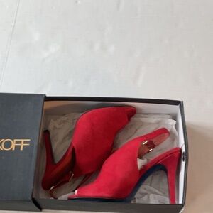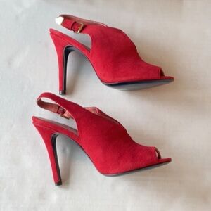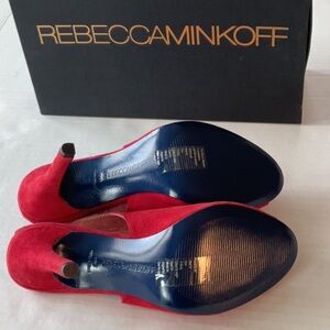 Add that pop of red with style! These fabulous Rebecca Minkoff red suede heeled mule with peep toe are right out of the box never worn. Adjustable sling back strap.