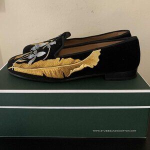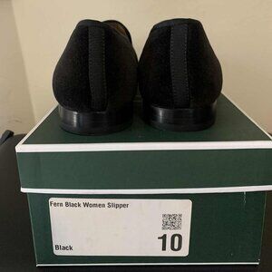 Fern Boston Black slipper features a Black Cotton-Velvet Upper with a Black Grosgrain Trim. Finished off with Colefax and Fowler Fern embroideries in gold.