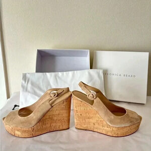NWB Veronica Beard Dali Suede Leather Cork Wedge Open Toe Heels Sand Size 9.5