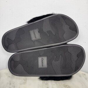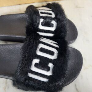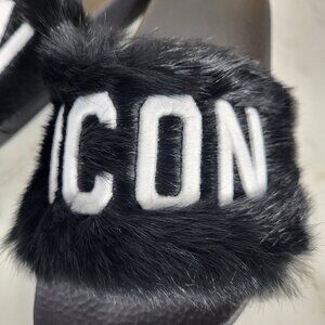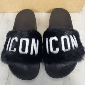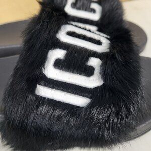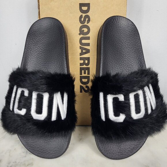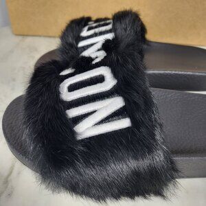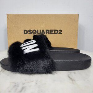 NWB~$825~DSQUARED2~8/8.5~ICON BLACK WHITE GENUINE RABBIT FUR SANDALS SLIDES~MADE IN ITALY. GENUINE DYED BLACK RABBIT FUR. WHITE EMBROIDERED ICON LOGO. SLIP ON. SIZE 39. FITS US SIZE 8/8.5. ORIGINAL BOX INCLUDED.