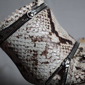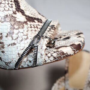 Italian-made sandals in python print leather with zip openings. The style is set on a stiletto heel and leather sole embossed with the Equestrian Knight Design.