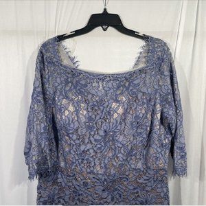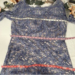 Boatneck, lace, aline dress features V back and 3/4 length sleeves