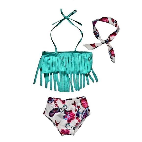 NWOT MIA BELLA SWIMSUIT 3 PIECE BIKINI POMS TURQUOISE, HOT PINK, WHITE SIZE 12-24 MTHS