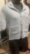 Chic light blue knit blouse. Features short sleeves and button front. Cropped design with collar.