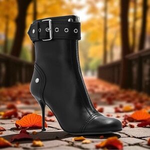 Front zipper, adjustable ankle strap, stiletto pin heel, round toe, approximately 3.5”.