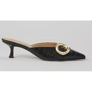 NWOB Ann Tayloe Black Croc Embossed Buckle Kitten Heels Slides Gold Buckle 9.5