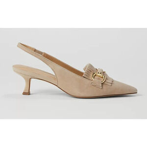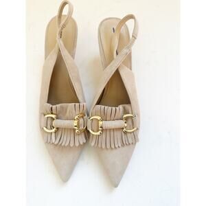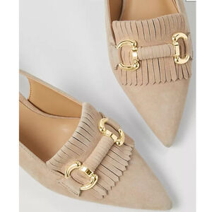 NWOB Ann Taylor Horsebit Fringe Suede Kitten Heels Tan Gold 9