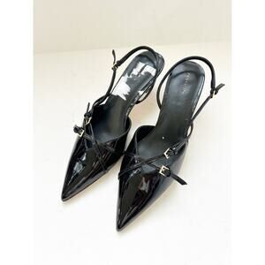 NWOB Ann Taylor Strappy Pointy Toe Patent Pump Black 9M Gold Buckles