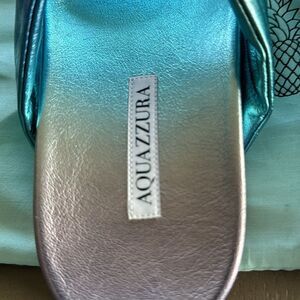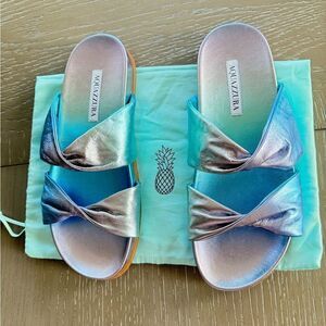 NWOB Aquazzura Twist Leather Metallic Blue Sandals Slides Made in Italy Size 38