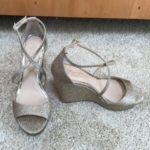 New! Jewel Badgley Mischka Size 8.5 metallic wedge platforms with ankle strap. Great evening wear.