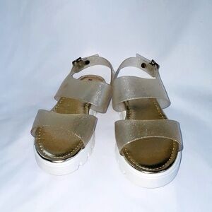 White chunky platform bottom, clear jelly like straps with light sparkle