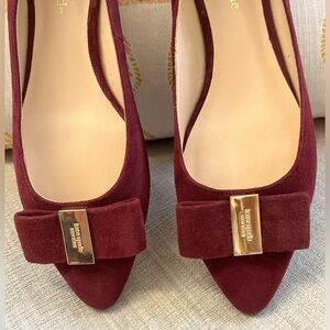 Before you know it, the holidays will be here and these gorgeous Kate Spade Burgundy Suede flats will be the finishing touch to your festive outfit. Dress up or down, the pointy toe shoes feature a stylish bow accent and gold logo bar. New; only tried on in store.