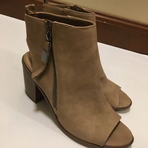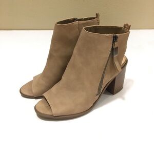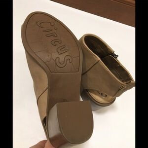 NWOT Circus by Sam Edelman Kammi Peep Toe Bootie Shoes.Faux leather upper in an ankle bootie style with a peep toe. Side zipper. Open heel.Smooth lining, cushioning insole. Manmade outsole, 3 and 1/4 inch stacked heel. Colour: Oatmeal/tan, no trades