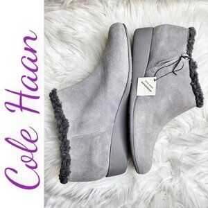 NWOB COLE HAAN Grand OS Callie Waterproof Suede Faux Shearling Wedge Bootie Gray, Size 10