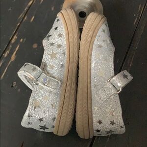 NWOB These adorable silver glitter with metallic star shoes features a Mary Jane strap, and gum rubber sole to provide the comfort of a sneaker. Removable inserts give growing feet a little wiggle room. Velcro strap.