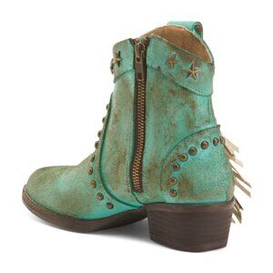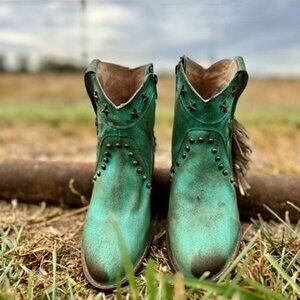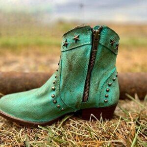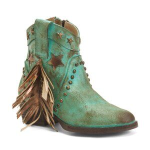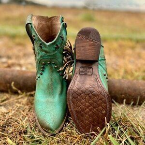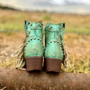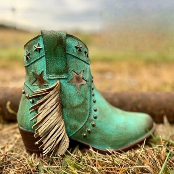 Show your wild side with this New Circle G short bootie! This one features a rustic turquoise leather with fringe and star studs and inlays, western round toe, leather oursole, and zipper on the inner side for easy off and on! Dress this one up or wear it as an everyday boot!
