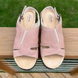 Clarks brand, Merliah style, color is called sand which is a light tan color, leather wedge sandals, adjustable slingback strap, cushioned comfort footbed for all day wear, wedge heel is approximately 2 inches, women's size 8.5 N, NARROW, brand new without box or tags, NWOB, NWOT condition