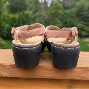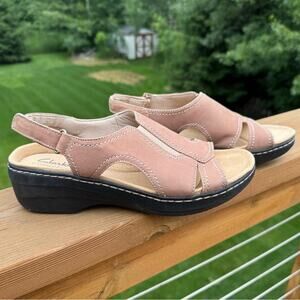 Clarks brand, Merliah style, color is called sand which is a light tan color, leather wedge sandals, adjustable slingback strap, cushioned comfort footbed for all day wear, wedge heel is approximately 2 inches, women's size 8.5 N, NARROW, brand new without box or tags, NWOB, NWOT condition