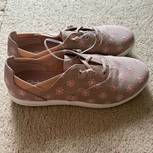 These Cloudsteppers by Clarks Breeze Ave sneakers are perfect for casual outings. Featuring a taupe color with floral embroidery, these shoes offer comfort and style. Made from washable materials, they're designed for easy maintenance.