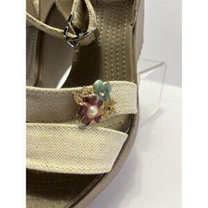 These super-cute sandals in size 9 are stylish and comfortable and designed for women. Featuring a high wedge heel and a strappy cross ankle strap, these beige canvas sandals by Crocs offer a trendy and chic look. The rubber outsole provides durability and stability, making them perfect for various occasions. Upgrade your shoe collection with these fashionable and versatile sandals that combine quality and style.