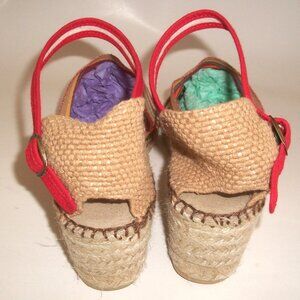 Alive and snappy - a pair of NEW unworn Diego "Carmen" handmade espadrilles with cushioned textile insoles, rubber soles and side-snap-strap that adjusts in length via its buckle.Marked 39 - 9M US. Heel flat under a 2.5" wedge Insole 10.25" Width 3.25"