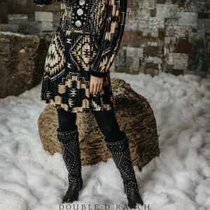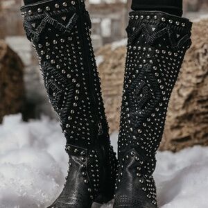 ‘KICK’ IT UP A NOTCH with Double D Ranch Legend Keeper Boots! New without the box, they scream SMOKE SHOW! DD's taken studding to a whole new level with a shaft that's heavily embellished with metal studs and dimensional leather lacing detail. Even the snip toe has studs! Retails for $995. Black leather with 17" shaft. Heel 1 3/4". Standard width.