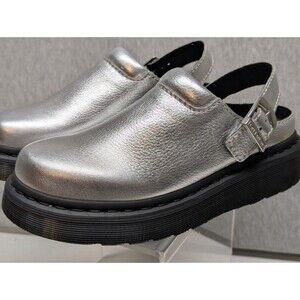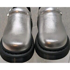 The product is a pair of NWOB Dr Marten Laketen women's silver metallic leather slingback clogs, featuring a buckle closure and standard shoe width. These stylish mules are designed in a slipper style and have a solid silver color. The Dr. Martens brand is known for its quality and durability, making these shoes a fashionable and reliable choice for women looking for a unique and eye-catching footwear option.