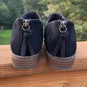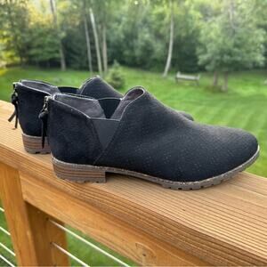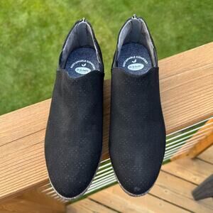 Dr. Scholl's brand, Roll Call style, black faux suede comfort booties or shooties, a perforated bootie that's easy to wear and easy to love. This comfy, crafted, versatile bootie is everything you need in your closet, zipper up backs of ankles for easy on and off, round or almond shaped toe, women's size 8.5, new without tags or box, NWOT, NWOB condition