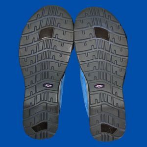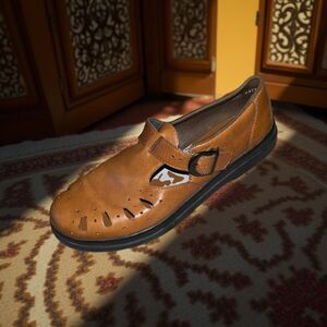Leather uppers, vented sides, and stretchy strap across the top of the foot.