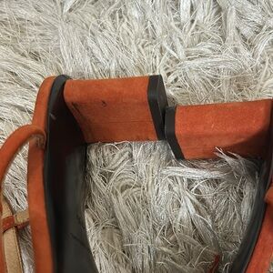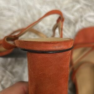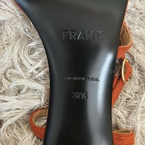 FRAME Le Braxton Suede Square Toe Strappy Sandals in Orange. Size 37.5. US 7. Brand new without box, yet have a small mark on the back of the right heel and what seems to be a tiny cut on the edge of the heel from handling in store. Please refer to photos. Retail $398, price reflects the flaws.