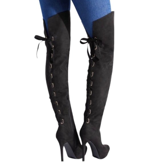 Shoe Dazzle Jannella Faux Suede Thigh High Gold Lace Up Back Boot