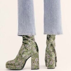 NWOB Free People Smyth Green Floral Velour Platform Block Heel Boots Size 10