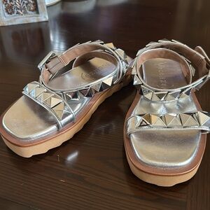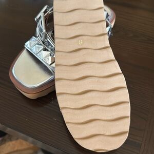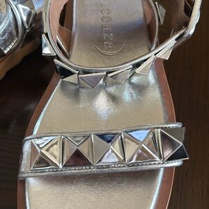 Anthropologie Vicenza Leon Studded Sandals silver Embellished NEW Size 37. Strappy and studded, these sandals add an effortless touch of edge to any look. Features: Single strap upper and crossover ankle strap closure, pyramid stud embellishments, cushioned insole, low platform heel. So perfect for incorporating texture into your outfit, pair these with your favorite jeans or maxi dress for endless ways to wear. Leather, Rubber. Imported. New never worn. Fast shipping.