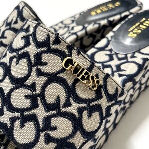 Step into Y2K style with these bold GUESS platform slide sandals in a statement monogram denim print! đĄ These slip-on open-toe shoes feature a thick platform sole and iconic âGUESSâ gold hardwareâperfect for that trendy retro vibe đ.