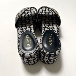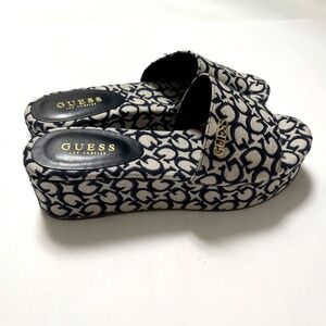 NWOB GUESS Monogram Denim Logo Platform Slides Sandals Size 10M Blue Beige