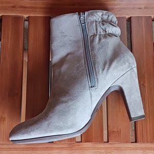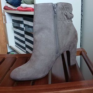 New without Box - Excellent condition. Never worn. Heeled Booties from Kelly & Katie. Brushed suede material in Taupe. Stylish rouching detail at ankle. Side zipper for easy on. Heel height 3.75 inches. Very clean. No apparent scuffs or marks.