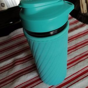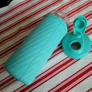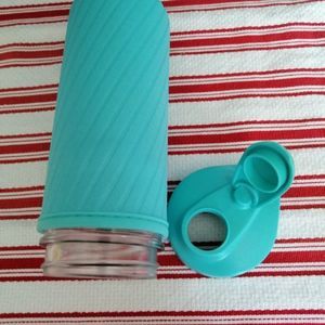New. Never Used. Aqua Quilted fabric covers the glass tumbler. Easy to remove for washing. 12 oz.