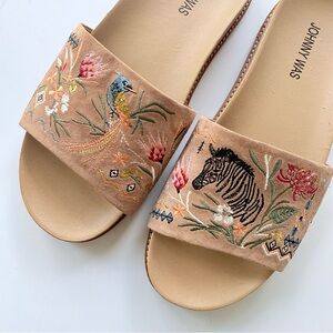 The Watipaso Slide Sandal by Johnny Was - tan suede slides, with embroidered with multicolor floral and animal motifs, a different design on each shoe, and a rubber sole. Size 10. New without box, but with light wear from storage and handling. Gorgeous shoes. Retail was $238.