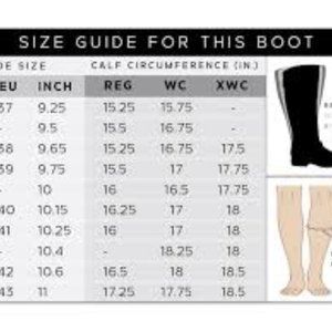 ♥ Upper Material: Faux Leather ♥ Toe Style: Round ♥ Heel Height/Type: 1-in Stacked ♥ Closure Type: Inside Zip ♥ Shoe Width: Medium ♥ Footbed: Padded ♥ Shaft Height: 17-in ♥ Calf Circumference Reg: 15 1/2-in ♥ Calf Circumference Wide: 17-in ♥ Calf Circumference Extra Wide: 17 3/4-in