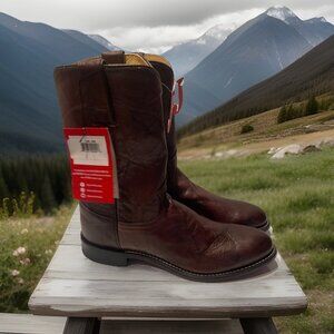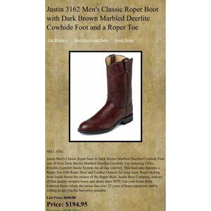 Elevate your style with these stunning Justin Roper boots. The marbled brown and black leather creates a unique and eye-catching pattern that is perfect for any occasion. The mid-calf shaft style and round toe shape make these boots both comfortable and stylish.