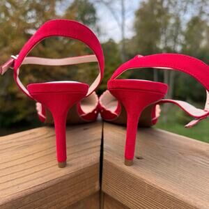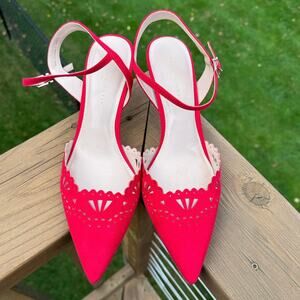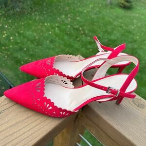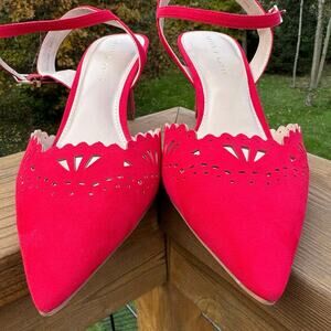 Kelly & Katie brand, Zabell style, color is called Holiday Red, microsuede or faux suede heels with adorable scalloped cut and laser perforated cut out design, pointed toe, adjustable ankle straps with buckle closure, women's size 11, brand new without box or tags, NWOB, NWOT condition