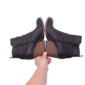 Tags: Korks Heidi ankle bootie size 9.5M, black faux leather heeled bootie, buckle strap detail boots, stacked block heel booties, round toe ankle boots, slip on side zip booties, cushioned footbed comfort boots, stylish everyday fall boots, women’s dress casual ankle booties