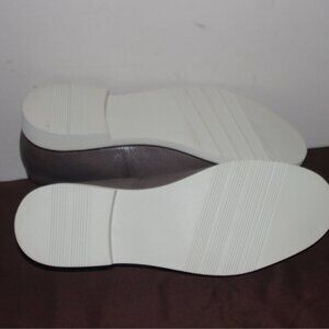 New without the box. Dark Taupe leather uppers with a nicely cushioned insole and extra padding in the arch area. 1 inch flat heels and textured rubber sole. There is elastic goring on each side of the foot opening for added comfort. Size 9 1/2 w