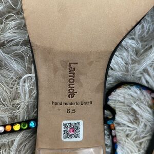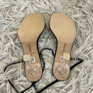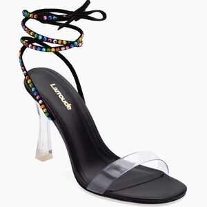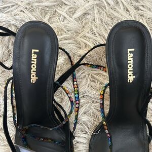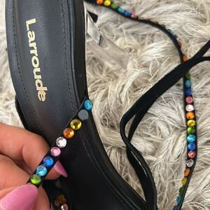 NWOB Larroude Disco Gloria Embellished Wrap Sandals in Black Leather/Vinyl 6.5
