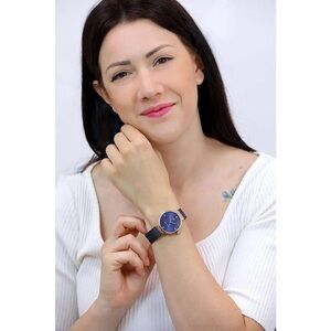 The strap of this model is made from blue PVD-plated stainless steel and is finished with a folding clasp.